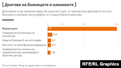 Должничката листа на болници кои имаат блокирани сметки е голема. Според изворите на Радио Слободна Европа најмалку осум клиники и две општи болници имаат блокирани сметки од извршители.